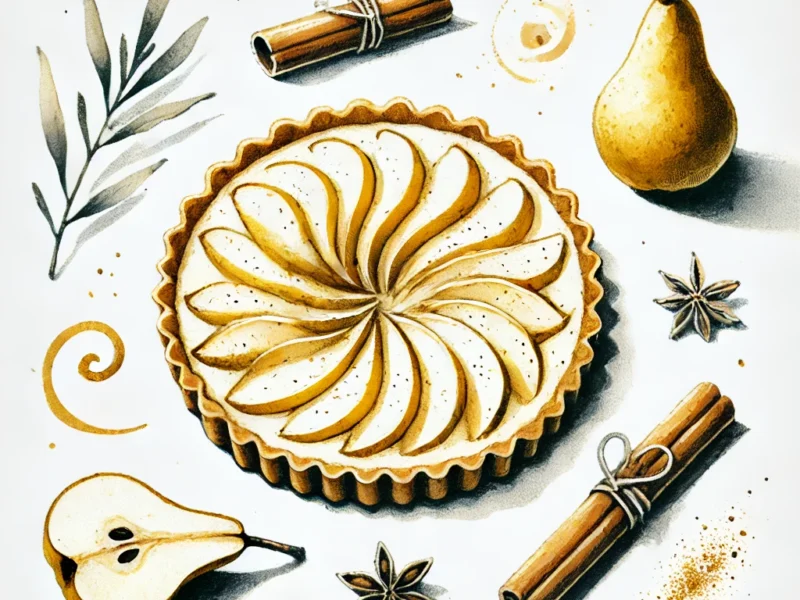 The Spiced Pear Tart is an elegant combination of tender, spiced pears nestled in a buttery, flaky crust. Infused with warm flavors of cinnamon, nutmeg,